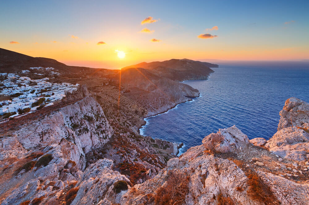 Relatively untouched by international tourists, Folegandros island still manages to keep its unspoiled charm. The hilltop Chora is among the most beautiful in the Aegean — timeless, romantic, and peaceful. The hilltop Chora is among the most beautiful in the Aegean. Tavernas here are serving special local delicacies and fine Greek wine.