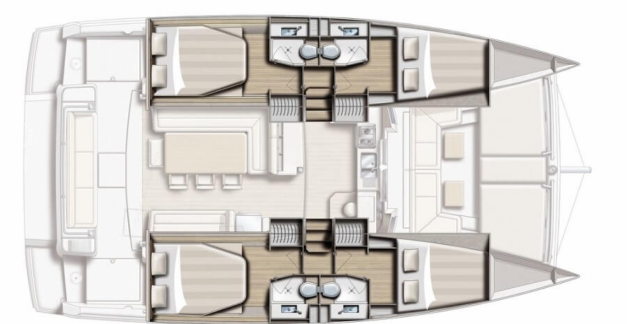 It also offers a large front cockpit with sunbeds, a relaxation area on the breathtaking roof, a platform connecting the two rear skirts with a large bench, and a general comfort worthy of a large catamaran.