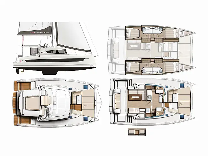 The BALI 4.2 presents all the innovations aboard a boat signed by BALI CATAMARANS. In addition to the essential “BALI door”, there is direct access between the galley and the foredeck through a watertight door, without needing to go round the outside. The various relaxation areas, found on the flybridge and in the rigid forward cockpit offer comfortable sun loungers simply inviting you to laze around and relax.