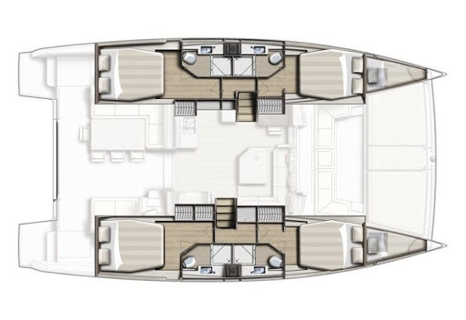 The 4-cabin version we sailed includes plenty of privacy and accommodations for the owners in the port hull that reminded me of a compact urban apartment. The two guest cabins in the starboard hull are very pleasant as well, with dimensions more typical of a boat this size. The apartment theme, which Catana calls “Loft Mode,” continues on the main deck, where there’s an unusual division of the galley space, with the cooktop and sink forward, and the household-size fridge and microwave to starboard and aft.