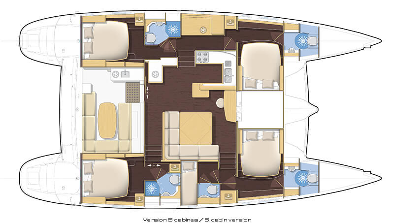 The 560, gave Lagoon a strong lead in terms of comfort, ergonomics and style, combining the world-renowned talents of the architectural firm VPLP and the design consultants Nauta. The version offers an additional choice of layouts which are unequaled for this size of catamaran: up to 5 fully independent cabins and the choice between a galley in the port hull or as a center island. The fly bridge is a veritable upper-deck salon (access via closable stairway). Its helm station provides perfect visibility and includes a magnificent spot for sunbathing at the rear.