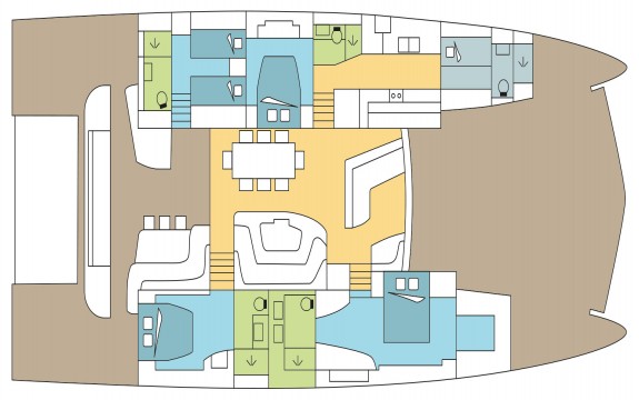 The remaining guest accommodation is just as airy and spacious, with three lavish cabins each with ensuite, and the fully-equipped professional galley from which the onboard Chef will create gourmet menus entirely personalized for you and your guests.