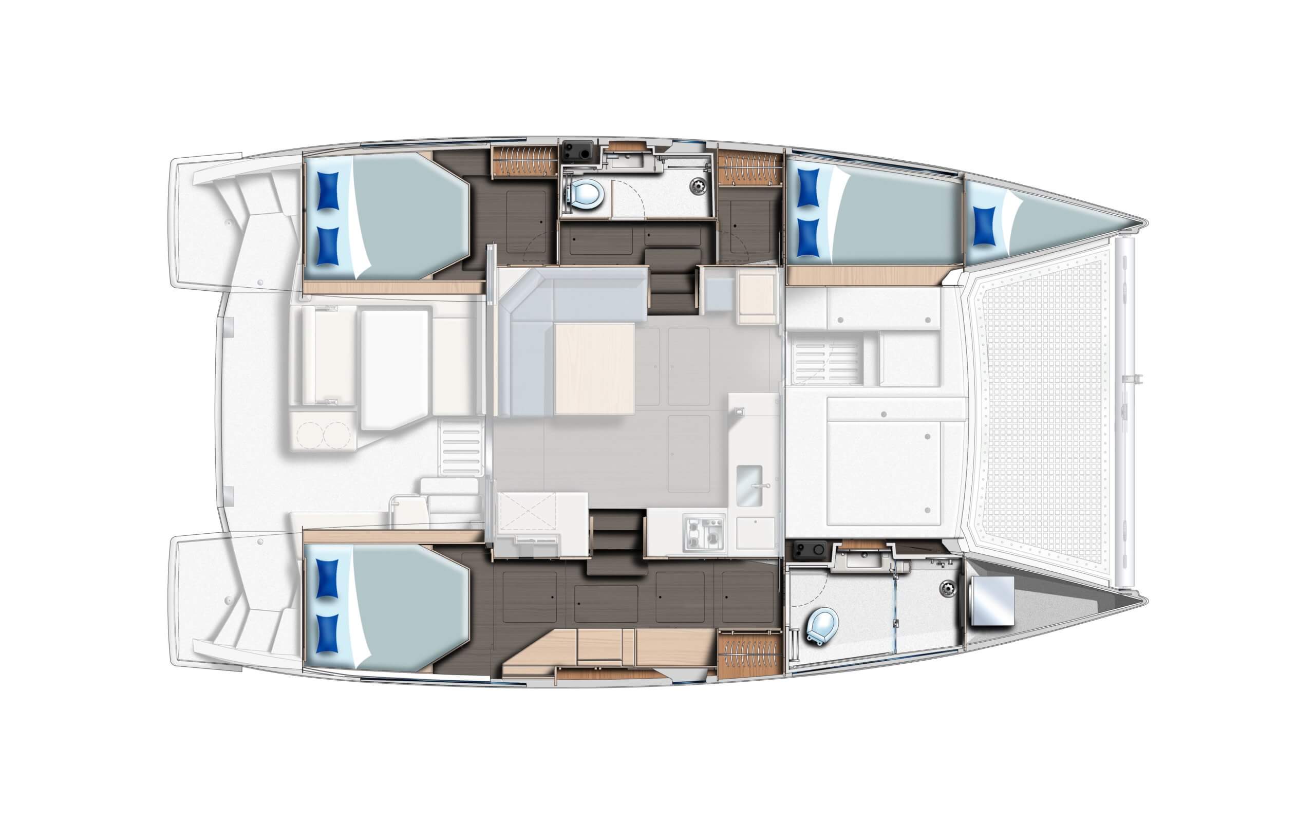 Continuing in the pursuit of innovation while taking into consideration customer and owner feedback, the 2019 model of the Leopard 40 now features aft cabin reconfigurations that offer more space below for added comfort. The redesigned aft cabins now boast semi-island berths, access steps, concealed strip lighting under shelves, berths, and ceiling fixtures,and more overall space than the previous Leopard 40. The owner suite desk and storage units were intelligently rearranged within the suite to allow for a more refined layout. This new layout further expands upon the open air concept of the Leopard Catamarans line. The port aft cabin also underwent the same reconfiguration less the owner cabin desk arrangement.